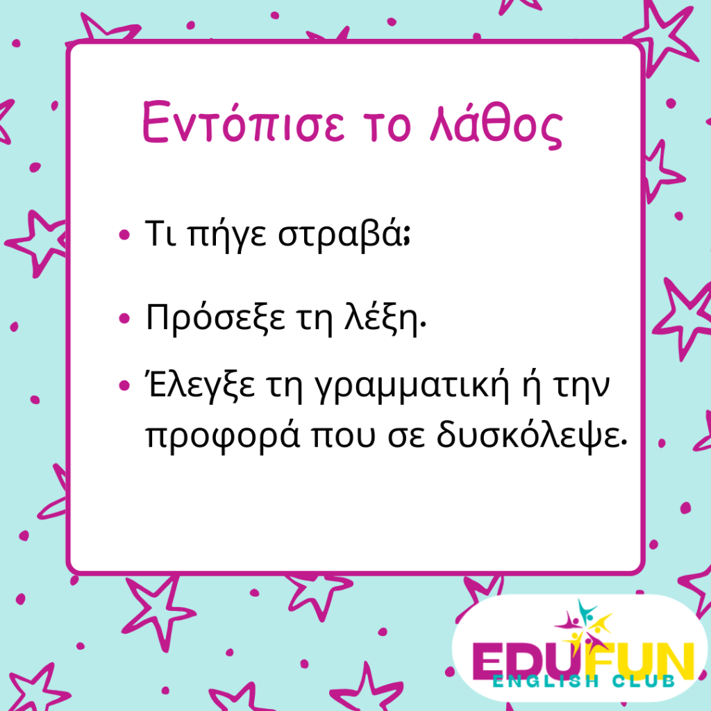 1. Εντόπισε το λάθος – Τι ακριβώς πήγε στραβά; Πρόσεξε τη λέξη, τη γραμματική ή την προφορά που σε δυσκόλεψε.