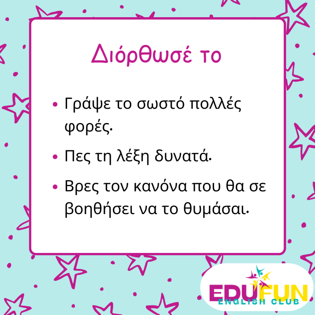 3. Διόρθωσέ το – Γράψε το σωστό πολλές φορές, πες τη λέξη δυνατά ή βρες έναν κανόνα που θα σε βοηθήσει να το θυμάσαι.